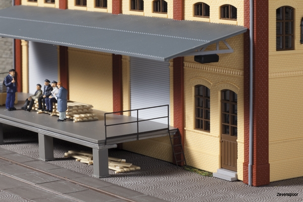 Mit diesem Modell lässt sich eine Bahn- oder LKW-Verladeszene darstellen. Zwei Rampen zur wahlweisen Nutzung und Lampen liegen bei. Die Rolltore sind auch im offenen Zustand darstellbar. Personal erreicht die Rampe über eine Leiter. Zur Innengestaltung sind Podest und Treppe mit Geländer vorgesehen.