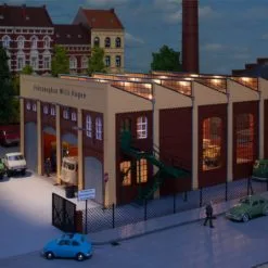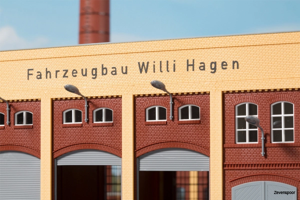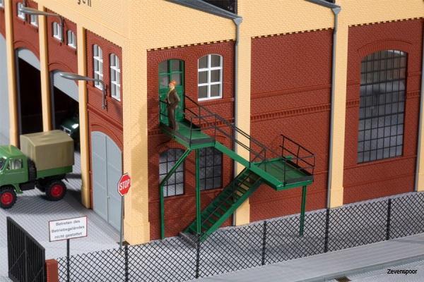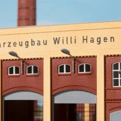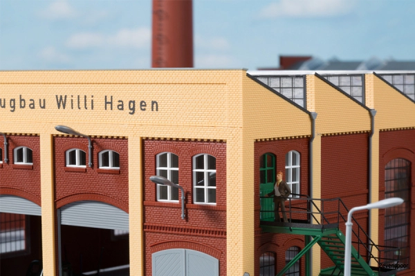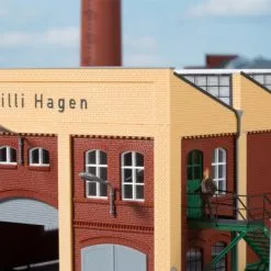 Im Bausatz sind außerdem enthalten: Traversen für die Oberleitung, Mast- und Wandpeitschenlampen, Lamellenlüfter, Innenwände zum Gestalten von Büro- und Lagerräumen sowie eine Außentreppe mit filigranem Geländer aus stabilem Karton in Lasercut-Technologie gefertigt. Bitte beachten Sie dazu unseren Basteltipp im Katalog oder unter www.auhagen.de.