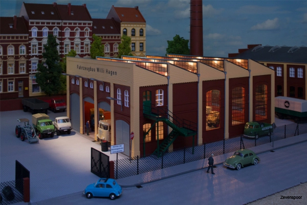 Für Straßenbahn, Bus und LKW sowie als Werkstatt geeignet. Wahlweise können grüne Flügeltüren oder graue Rolltore eingebaut werden. Die kleine Tür liegt in grün und grau bei.